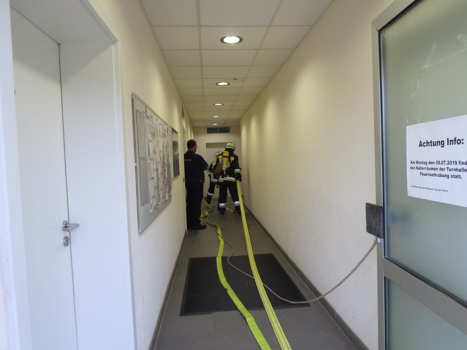 Gemeinsame Übung mit der Freiwilligen Feuerwehr Eislingen, Löschzug 3 in Ottenbach an der Gemeindehalle im Buchs. Nach einer Verpuffung in den Heizräumen waren zwei Personen im Kellergeschoss vermisst. Vielen Dank an die Kameraden aus Krummwälden für eure Teilnahme und den gemeinsamen Erfolg.